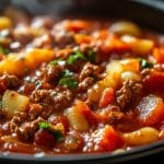 Pour in the diced tomatoes, tomato sauce, beef broth, salt, pepper, paprika, oregano, basil, and Worcestershire sauce. Stir everything together and bring to a simmer. Let it bubble for about 5 minutes to let the flavors meld.