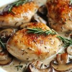 Juicy pan-seared chicken cooked with fresh rosemary and served with a rich, garlicky mushroom cream sauce.